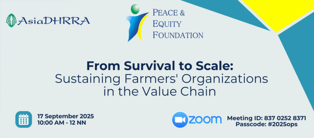 Peace and Equity Foundation, together with AsiaDHRRA, co-organized an online forum on September 17 to reflect on the journey of farmer organizations (FOs) and cooperatives in sustaining and scaling their enterprises. AsiaDHRRA presented the FO4A project experience and its challenges in reaching scale, shared summative insights, and synthesized the key lessons. Key takeaways include: Small and struggling […]